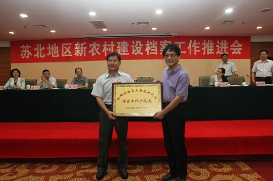 9月10日至11日,省档案局召开新农村建设档案工作推进会,会上举行了全国社会主义新农村建设档案工作示范市授牌仪式,东台市档案局局长杨爱国从省档案局局长谢波手中捧回由国家档案局、农业部、民政部联合颁发的牌匾。