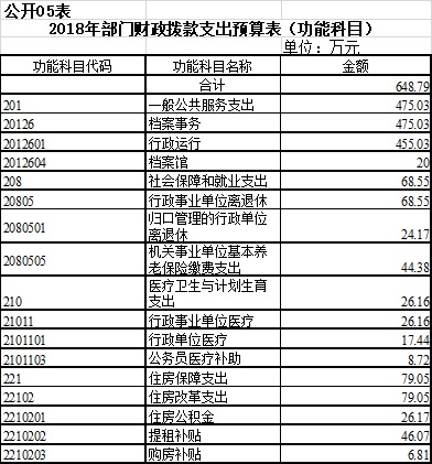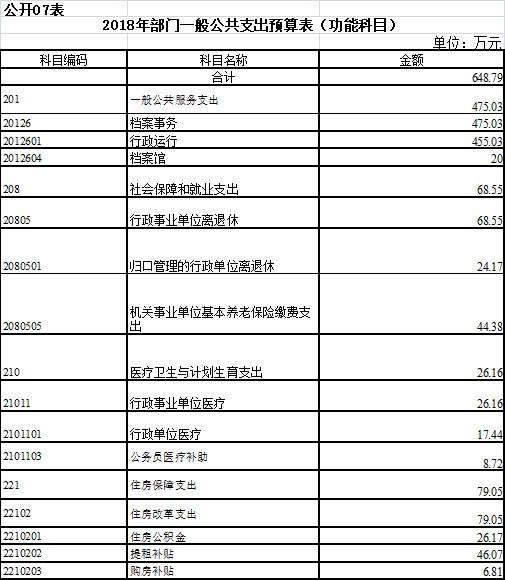 盐城市档案局2018年一般公共预算财政拨款支出预算648.79万元,与上年相比减少29.74万元,下降4.38%。主要原因是退休人员基本养老金由盐城市机关事业养老保险中心发放了。