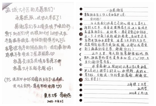 “草木蔓发,春山可望。江南连枝,惟愿安康。这段急难中的温情,必将深藏于复旦上医师生心中,激励我们在未来的教学、科研、医疗事业上常怀感恩,奋勇争先。”“黎明,拖着沉重的箱子和疲惫的步伐,你们站在寒风中迎接我们的到来;清晨,你们又继续为我们采集核酸、记录体温;下午,你们忙碌于调配我们的物资以及尽最大可能满足同学们各式各样的需求。谢谢你们!”“她们会兼顾专业性和人情味,虽然一丝不苟地完成采集,但尽可能温柔耐心地安抚。”……一封封感谢信中,字里行间流露的全是感动、感激之情。