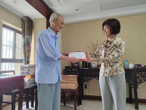 盐城市档案馆收集开发处处长王冬梅向李树江同志颁发档案捐赠证书