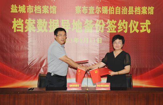 期间,盐城市档案馆与察布查尔锡伯自治县档案馆签署了档案数据异地备份协议,以应对各种突发事件可能对档案资源造成的损坏,确保档案绝对安全。