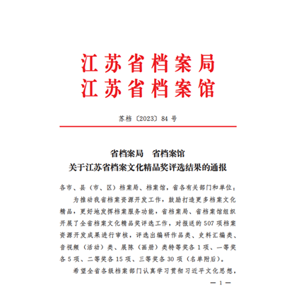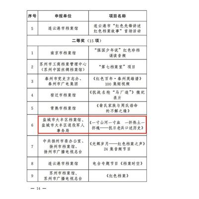 近日,由省档案局、省档案馆联合组织开展的2023年度全省档案文化精品奖评审工作已经揭晓。大丰区档案馆与大丰区退役军人事务局共同申报的《一寸山河一寸血、一抔热土一抔魂——抗日老兵口述历史》在评选中荣获音视频(活动类)二等奖。
