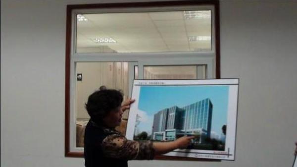 (图为大丰市档案局局长戚月兰展示新馆效果图)